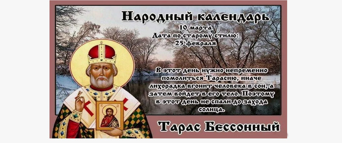Дата в 2026 году: 10 марта , вторник Другие названия: Тарасий-кумошник; Тарас-трясучник; Вешняя дрема; Тарас; кумоха Церковное название: Святителя Тарасия, архиепископа Константинопольского Значение: Почтение памяти святого Тарасия Традиции: Молитвы святому Тарасию о защите от лихорадки Народный праздник Тарас Бессонный отмечается 10 марта 2026 года (по старому стилю – 25 февраля). В православном календаре это дата почтения памяти святителя Тарасия Константинопольского, архиепископа. Название праздника «Бессонный» пошло от того, что в этот день нельзя ложиться спать днем. Суеверия гласят, что так в организм проникает болезнь. Сперва она убаюкивает человека, а затем входит в спящего. Детям также не дают дремать до захода солнца. История Святитель Тарасий родился в конце VIII века в Константинополе. Родители дали ему хорошее образование. Благодарю этому он стал царским советником. Во времена религиозного движения, направленного против святых ликов христианства, патриарх Павел удалился в монастырь. На свой пост он назначил Тарасия, который в тот момент вел мирской образ жизни. В 784 году он прошел все монашеские ступени и вступил в должность патриарха. Спустя три года созвал Вселенский Собор в Нике для утверждения почитания христианских икон. Следующие 19 лет, до самой кончины, Тарасий управлял Церковью. Он отличался мудростью, аскетизмом и исключительной добротой. Большую часть времени уделял старикам, нищим, больным, сиротам и вдовам. Во время праздника Пасхи накрывал для них стол, за которым прислуживал сам. В 806 году епископ скончался. Традиции и обряды В этот день молятся святому Тарасию и просят у него защиты от лихорадки. Данная болезнь предками воспринималась как некое демоническое существо, которое живет в лесу со своими сестрами. Появление симптомов заболевания в зимне-весенний период сейчас легко объяснить переменчивостью погоды. Но предки верили, что лихорадка (по-старому кумоха или трясучка) приходит на рубеже сезонов потому, что люди ослаблены после холодной зимы. Приметы Если выпал снег, то перед Пасхой семь дней будет ненастье. Грач на дереве вьет гнездо – к стабильному теплу. Если вороны сильно раскричались, значит, лето будет обильным на дожди и холод. Высаженные на Тараса Бессонного помидоры и капуста дадут богатый урожай. Нельзя спать до заката – можно заболеть. Нельзя смотреть в окна домов с улицы, иначе лихорадка обязательно нападет. Если в этот день найти сброшенную змеиную шкуру, то она защитит от любой болезни. Для этого ее нужно всегда носить при себе. Если с петель сорвется входная дверь, то стоит ждать большой беды. Может случиться все, что угодно: начиная от смерти близкого родственника и заканчивая пожаром или эпидемией. | |