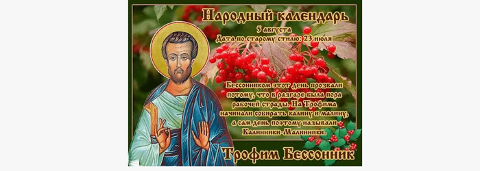 ТЕЛЕГРАММ замедляется.Вероятно скоро его заблокируют.Чтобы не потерять нас и получать оперативно информаци. подпишись на наши каналы в МАХ.Кто еще не подписался В полностью Российской сети МАХ на каналы ВОЕННЫЕ ПЕНСИОНЕРЫ ЗА РОССИЮ И ЕЕ ВООРУЖЕННЫЕ СИЛЫ: Канал для Военных пенсионерах без войны и политики, Военных пенсиях,пенсиях жен военных пенсионеров ,жизни военных пенсионеров и о способах прожить дольше : https://max.ru/voennyepen За Родину .Мы победим.: Оперативная информация О Спецоперации ,политике на канале: https://max.ru/join/aXh9SdoNhgk2rhy901ENolzCyoGLJhMgpon7E6np9n0 СРОЧНО ПОДПИСЫВАЙСЯ и ты будешь в курсе оперативных событий.НЕ пропусти!!! В Телеграмм создана группа " Военные пенсионеры за Россию и ее ВС. Мы победим". У кого есть Телеграмм просим вступить в нее. Там много интересного, срочного, очень оперативная информация, а также чего нельзя помещать в ОДНОКЛАССНИКАХ и на сайте. Вступить можно по ссылке: Военные пенсионеры за Россию и ее ВС. Мы победим "https://t.me/voenpenszaRossiu" Очень большая просьба НЕ ОТПИСЫВАТЬСЯ ОТ КАНАЛА, Канал работает в тестовом режиме. Мы стараемся понять, что Вам будет интересно читать и как работать дальше. Пишите, что бы Вам хотелось читать в ТЕЛЕГРАММ. Хоть в любой теме на сайте, хоть в Телеграмм. Чтобы не раздражали уведомления их можно ОТКЛЮЧИТЬ. Кого раздражают уведомления в Телеграмм их можно отключить. Отключить уведомления можно нажав на надпись ОТКЛЮЧИТЬ УВЕДОМЛЕНИЯ внизу Дата в 2025 году: 5 августа , вторник Другие названия: День Трофима; Страда; Калинки-малинки Церковное название: Мучеников Трофима, Феофила и с ними 13-ти мучеников Значение: Посвящен дню памяти мученика Трофима Традиции: Полевые работы; выпечка пирогов с калиной и малиной Трофим Бессонник отмечается 5 августа 2025 года (по старому стилю – 23 июля). В церковном календаре этот день посвящен памяти святого Трофима и еще 14-ти мучеников, которые стали жертвами гонений христиан в конце III – начале IV веков. Когда мужчинам предложили на суде отречься от своей веры и провести жертвоприношение языческим идолам, они отказались. После долгих и мучительных истязаний, которые не изменили их решения, несчастным перебили голени и бросили в огонь. Но стойкие мужи вышли из пламени самостоятельно и без малейших повреждений. Потеряв всякую надежду сломить волю христиан, язычники отрубили им головы. Традиции и обряды На Трофима Бессонника приходится самая напряженная работа на полях. Рачительному хозяину не до отдыха, - нужно косить, жать и убирать хлеб. Отсюда и название «Бессонник», то есть отдыхать некогда. А еще к этому сроку как раз поспевает калина и малина, и хозяйки начинают печь пироги с ягодами и делать запасы на зиму – варенье, повидло, компоты и вино. Поэтому данный праздник называют еще как «Калинки-малинки». Приметы Если вечером стелется туман – значит, погода будет хорошая. Перед самым рассветом звезды ярко сверкают – это к дождям через два-три дня. | |