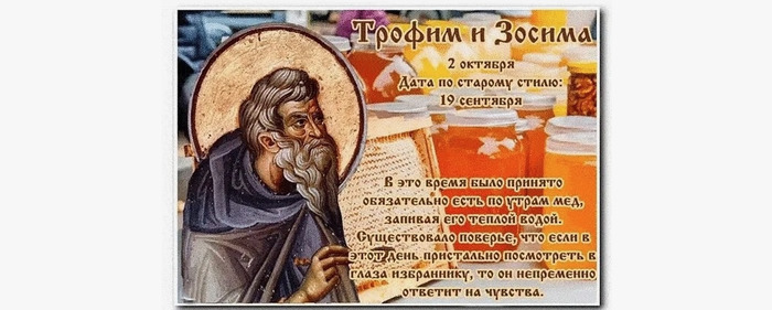 ТЕЛЕГРАММ замедляется.Вероятно скоро его заблокируют.Чтобы не потерять нас и получать оперативно информаци. подпишись на наши каналы в МАХ.Кто еще не подписался В полностью Российской сети МАХ на каналы ВОЕННЫЕ ПЕНСИОНЕРЫ ЗА РОССИЮ И ЕЕ ВООРУЖЕННЫЕ СИЛЫ: Канал для Военных пенсионерах без войны и политики, Военных пенсиях,пенсиях жен военных пенсионеров ,жизни военных пенсионеров и о способах прожить дольше : https://max.ru/voennyepen За Родину .Мы победим.: Оперативная информация О Спецоперации ,политике на канале: https://max.ru/join/aXh9SdoNhgk2rhy901ENolzCyoGLJhMgpon7E6np9n0 СРОЧНО ПОДПИСЫВАЙСЯ и ты будешь в курсе оперативных событий.НЕ пропусти!!! Для продолжения работы сайта Необходимы деньги для оплаты хостингов для сайтов ,основного и дополнительного.Если не соберем деньги ,то сайты будем вынуждены закрыть. Кто хочет помочь сайту добровольно, перечислите деньги в сумме от 1 рубля на карту 4006800071005382 Деньги перечислить можно через мобильное приложение Вашего банка , можно обратиться в банк или через банкомат . В сообщении получателю указывать :Для сайта .Информация о количестве собранных денег будет публиковаться регулярно .Как насобираем необходимую сумму сбор пожертвований для оплаты сайта будет прекращен . Больщое спасибо за поддержку сайта: Виктору Р.-1000 руб, Виталию Б.-300 руб Дата в 2025 году: 2 октября , четверг Другие названия: Трофим; Трофимов день; Трофимовы вечерки; лакомый стол; Зосима; заступник пчел; пчелиная девятина; день пчельников Церковное название: Мучеников Трофима, Савватия и Доримедонта; мученика Зосимы пустынника Значение: Почтение памяти святых Трофима и Зосимы Традиции: Подготовка ульев к зиме и сбор меда; поиск своей «второй половины» на вечерних гуляньях Этот праздник отмечается 2 октября 2025 года (19 сентября по старому стилю), когда православная церковь чтит память святых мучеников Трофима Синадского (Фригийского) и Зосима Киликийского. Эта же дата – начало народного праздника пчеловода, который длится девять дней. Мученик Трофим просил Господа образумить людей, участвовавших в разнузданном пьяном бесчинстве во время языческого гуляния. За это его схватили. Он выдержал все пытки и не сломился духом. Желая добиться своего, язычники отправили Трофима в Синад к жестокому истязателю, который также не смог заставить его отказаться от веры. После этого его казнили. Святой Зосима, не желая жить рядом с язычниками, удалился в пустыню. Однажды встреченный им правитель Киликии был поражен тем, как старца слушались все животные. Но узнав, что тот христианин, приказал арестовать и мучить его, пока он не откажется от своей веры или звери не придут спасти его. Зосима обратился с молитвой к Богу, и тут же рядом с мучеником появился огромный лев. Правитель испугался и приказал отпустить Зосиму. В тот же миг святой умер. Традиции и обряды Зосима в народе чтится как заступник пчелиного роя. 2 октября – начало пчелиной девятины. В этот день проходит подготовка ульев и омшаника к зимнему периоду и сбор меда. Каждый из девяти дней начинается с меда, запиваемого теплой водой. Пчелу почитают также за воск, из которого делаются церковные свечи. Начинаются вечерние гулянья, на которых парни и девушки присматривают вторую половину. По легенде, если посмотреть в глаза избраннику и не отводить взгляд, он непременно ответит взаимностью. Приметы Южный ветер прогнозир