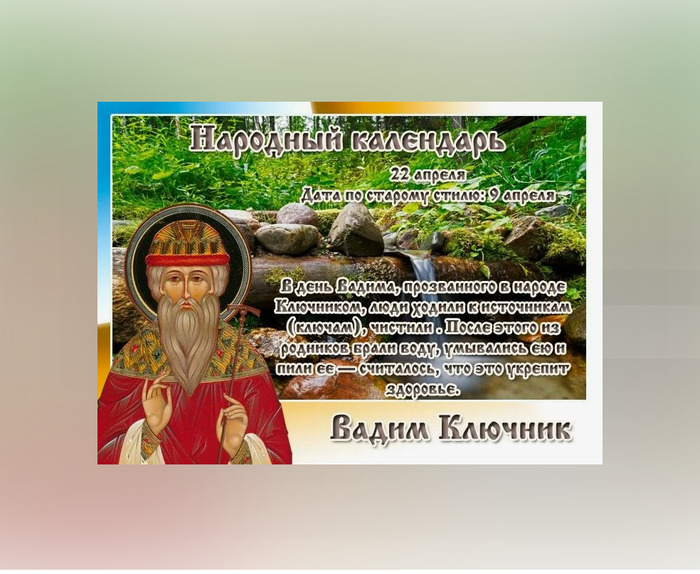 ТЕЛЕГРАММ замедляется.Вероятно скоро его заблокируют.Чтобы не потерять нас и получать оперативно информаци. подпишись на наши каналы в МАХ.Кто еще не подписался В полностью Российской сети МАХ на каналы ВОЕННЫЕ ПЕНСИОНЕРЫ ЗА РОССИЮ И ЕЕ ВООРУЖЕННЫЕ СИЛЫ: Канал для Военных пенсионерах без войны и политики, Военных пенсиях,пенсиях жен военных пенсионеров ,жизни военных пенсионеров и о способах прожить дольше : https://max.ru/voennyepen За Родину .Мы победим.: Оперативная информация О Спецоперации ,политике на канале: https://max.ru/join/aXh9SdoNhgk2rhy901ENolzCyoGLJhMgpon7E6np9n0 СРОЧНО ПОДПИСЫВАЙСЯ и ты будешь в курсе оперативных событий.НЕ пропусти!!! Дата в 2024 году: 22 апреля , понедельник Другие названия: Вадим; День отмыкания родников; Вадим – отомкни родники Церковное название: Преподобномученика Вадима Персидского, архимандрита Значение: Почтение памяти святого Вадима Персидского Традиции: Чистка источников, умывание и употребление родниковой воды; гадание по источнику на больного человека; выгон скотины на луга; проверка готовности земли к началу пахотного сезона Народный праздник Вадим Ключник отмечается 22 апреля 2024 года (по старому стилю – 9 апреля). В церковном календаре это дата почтения памяти преподобного мученика Вадима Персидского, архимандрита. Праздник прозван «ключником» в честь родников, ключей, которые бьют из-под земли. История Святой Вадим жил в IV столетии. Он был родом из города Вифлапаты в Персии, из богатой и высокородной семьи. Еще в молодости Вадим познал христианское учение, раздал часть своего наследства. На оставшиеся деньги построил монастырь в пустыне, в котором и поселился. В скором времени к нему присоединились семь человек и стали его учениками. В 376 году, во времена гонений на христиан, которые начал царь Персии Сапор, Вадима с учениками арестовали. На протяжении четырех месяцев их ежедневно подвергали различным мукам, чтобы они отреклись от своей веры и поклонились идолам. В той же темнице был заключен некий христианин Нирсан. Мучения, которым его подвергли, оказались для мужчины непосильными. Он отрекся от Христа. От него потребовали в доказательство убить святого Вадима. Нирсан боялся новых истязаний и согласился на убийство. Когда перед ним поставили преподобного и вложили в руки меч, его замучила совесть. Он не сразу смог убить мученика. Вадим спокойно стоял и терпеливо ждал, когда ему отрубят голову. Когда Нирсан это сделал, он не перенес душевных мук и убил себя тем же мечом. Традиции и обряды На Вадима Ключника ходят к источникам, чистят их, набирают родниковой воды, умываться ею и пьют. В этот день ключевая вода дарит силы и укрепляет здоровье. С давних пор существует обряд гадания на больного человека по источнику. Для этого нужно пойти к воде, ни с кем не разговаривать по дороге, помолиться на четыре стороны и спросить у воды, выздоровеет ли тот, о ком мыслишь. Если вода останется гладкой и чистой, значит, человек оправится от болезни, и его ждет долгая жизнь. Если вода начнет булькать или бурлить – это плохой знак. Стоит приготовиться к худшему. К этому сроку на лугах уже хватает свежей травы. На Вадима Ключника начинают выгонять на них скотину. Землепашцы проверяют землю на полях, готова ли она к началу пахотного сезона. Берут комок почвы, немного сдавливают и бросают вниз. Если она рассыпается, то земля готова к работе; если 