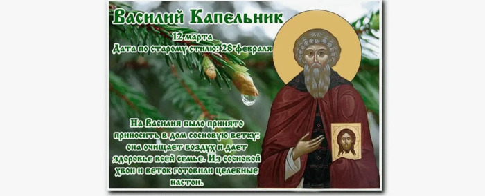 Дата в 2026 году: 13 марта , пятница Другие названия: Солнечник; Плач зимы; Василий Исповедник; Васильев день; Василий теплый; Капитель; Каплюжник; Овечья одышка Церковное название: Преподобного Василия Декаполита Значение: Почтение памяти святого Василия исповедника из страны Декаполитской Традиции: Сбор почек хвойных деревьев; выпечка калачей; охота; лечение детей от водянки Народный праздник Василий Капельник отмечается 13 марта 2026 года (по старому стилю – 28 февраля). В православном календаре это дата почтения памяти преподобного Василия Декаполита. Название «Капельник» пошло от весенней капели, когда повсюду слышны звуки падающих капель от растаявшего снега на крышах. История Про почтенного Василия Декаполита известно немногое. Он жил в VII-VIII веках. Был монахом и христианским исповедником из страны Декаполитской. Во времена преследований почитателей святых икон его заточили в сырой темнице. После смерти правителя-иконоборца Льва Исаврянина – виновника ареста многих христиан, святой Василий получил свободу. Остальной его земной путь был наполнен монашескими делами, наставлениями людей на путь праведный и добродетельную жизнь. В 750 году преподобный Василий отошел в мир иной. Традиции и обряды 13 марта принято вносить в дом свежую еловую или сосновую ветку. Хвоя очищает воздух от зимы и дарит домочадцам здоровье. Также она применяется в виде витаминного отвара, который полезен маленьким детям и пожилым людям. Собранные в этот день почки хвойных деревьев хранят свои целебные свойства весь год. Девушки пекут калачи для родственников и друзей. Если с утра на голодный желудок съесть такой хлеб, то придет счастье и удача. Охотники на Василия Капельника редко возвращаются домой без хорошей добычи. Вечером устраиваются застолья с традиционными «правдивыми» байками. Раньше 13 марта лечили детей от водянки (народное название – овечья одышка) при помощи отары овец. Через укутанного в овечий тулуп ребенка прогонялись овцы и уносили болезнь с собой. Приметы Дождь идет весь день, значит, лето будет теплым. Какие края имеет тающий вокруг деревьев снег, такой и весна будет. Если они пологие – к мягкому сезону, если крутые – быть холодам. Чем длиннее сосульки, тем длиннее будет лен. Также длинные сосульки пророчат затяжную весну. Вокруг солнца видны круги – будет хороший урожай. Если грачи прилетели на Василия Капельника, значит, лето будет дождливым. Чтобы любимый не смотрел на других женщин, нужно в эту ночь быть с ним очень ласковой. | |