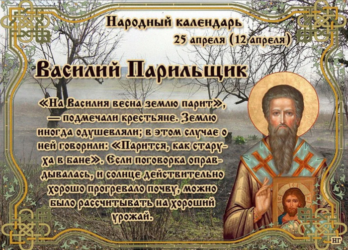 ТЕЛЕГРАММ замедляется.Вероятно скоро его заблокируют.Чтобы не потерять нас и получать оперативно информаци. подпишись на наши каналы в МАХ.Кто еще не подписался В полностью Российской сети МАХ на каналы ВОЕННЫЕ ПЕНСИОНЕРЫ ЗА РОССИЮ И ЕЕ ВООРУЖЕННЫЕ СИЛЫ: Канал для Военных пенсионерах без войны и политики, Военных пенсиях,пенсиях жен военных пенсионеров ,жизни военных пенсионеров и о способах прожить дольше : https://max.ru/voennyepen За Родину .Мы победим.: Оперативная информация О Спецоперации ,политике на канале: https://max.ru/join/aXh9SdoNhgk2rhy901ENolzCyoGLJhMgpon7E6np9n0 СРОЧНО ПОДПИСЫВАЙСЯ и ты будешь в курсе оперативных событий.НЕ пропусти!!! Дата в 2022 году: 25 апреля , понедельник Другие названия: Василий Парийский; Василий; День Василия Парильщика Церковное название: Преподобного Василия исповедника, епископа Парийского Значение: Почтение памяти святого Василия Парийского Традиции: Охота на зайцев; заговор от избавления тоски по человеку; заговор на воду на здоровье Народный праздник Василий Парильщик отмечается 25 апреля 2022 года (по старому стилю – 12 апреля). В православном календаре это дата почтения памяти святого Василия, епископа Парийского, исповедника. Название «Парильщик» праздник получил в честь паркой погоды. В этот период снег, как правило, уже окончательно тает, вода уходит в землю и солнце, которое подогревает почву, выпаривает жидкость. История Василий жил в VIII столетии в городе Парии (современная Турция). С приходом христианской веры в городе основали епископию. Одним из ее служителей горожане выбрали именно его. Люди уважали Василия за добродетельность и благочестие, считали истинным пастырем, который достоин возложенного на него сана. В период Реформации иконоборческая ересь коснулась и тех земель, где жил епископ Василий. Он решительно встал на защиту святых икон, открыто исповедал веру во Христа и охранял свою епархию от еретиков. Несколько раз его заставляли подписать постановление об уничтожении образов, но епископ не согласился. За свои действия Василий перенес гонения, грубые оскорбления и унижения со стороны последователей ереси. До конца жизни ему пришлось скитаться. Он проводил дни в скорби. Но перед Господом его душа предстала незапятнанной. Ни на мгновение он не допустил мысли о неверности своего жизненного пути. Традиции и обряды На Василия Парильщика охотятся на зайцев. По лесу нужно ходить очень осторожно. Ведь в этот день может выходить с берлоги после зимней спячки медведь и прятаться под кустом. В этот праздник молятся святому Василию о придании силы и храбрости, а также об избавлении от болезней. Вдовы и брошенные девушки, женщины, которые желают избавиться от тоски по человеку, на заре должны пойти к воде и прочесть специальный заговор, а затем обрызгать лицо левой рукой. Вода, которая заговорена особым способом на Василия Парильщика, укрепляет здоровье. Ее пьют и умываются по средам. Приметы Если стоит паркая солнечная погода, то год будет урожайным. Если идет дождь, то начало мая будет дождливым. Если к этому дню весь снег растаял, значит, зима отступила, и заморозков больше не будет. Если утро выдалось холодным, а день стоит ясный, то велика вероятность сухого лета и неурожая. Верба зацвела – к теплым дням. Заяц путь перебежал – к невезенью. | |