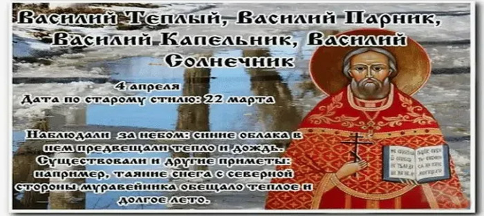 Дата в 2026 году: 4 апреля , суббота Другие названия: Василий Парник; Василий Капельник; Василий Солнечник; День Василия Солнечника; День Василия Солнечного; Солнечник; Тепляк Церковное название: Священномученика Василия Анкирского, пресвитера Значение: Почтение памяти святого Василия Анкирского Традиции: Выпечка пшеничных хлебцов в виде диска Народный праздник Василий Теплый отмечается 4 апреля 2026 года (по старому стилю – 22 марта). В православном церковном календаре это дата почтения памяти святого мученика Василия Анкирского, священника. Названия праздника – Теплый, Парник, Капельник, Солнечник – связаны с теплой солнечной погодой, которая наступает в этот день. История Василий служил священником в Галатийском городе Анкире в IV веке. Он призывал своих прихожан не поддаваться ереси и свято верить в Православие в то время, когда арианское лжеучение захватило широкие массы. Местные ариане на собрании смогли лишить священника сана за неугодное им противостояние. Но Палестинское Собрание епископов, на котором присутствовало 230 человек, силой своего влияния смогло вернуть Василию сан пресвитера. Он призывал людей одуматься и обличал приверженцев арианской ереси. За твердость убеждений Василия, как человека опасного для страны, подвергли преследованиям и мучениям. Для того чтобы обратить его в арианскую ересь, к нему подослали двух вероотступников. Но они никак не смогли повлиять на Василия. Он остался непреклонным в своей вере. За это его вновь подвергли мукам. В 362 году Анкиру посетил император Юлиан Отступник. Когда священника Василия привели на суд, он не испугался. Он открыто исповедал веру в Сына Божия и изобличил императора в отступничестве от истинной веры. После этого на его спине вырезали куски кожи. Затем жгли и кололи огненными прутьями в живот и плечи. Сперва мученик безропотно сносил истязание. Затем упал на землю, вознес молитву Господу и словно уснул с умиротворяющей улыбкой на лице. Случилось это 29 июня. Но в честь праздника святых Петра и Павла память о нем перенесли на 22 марта (по старому стилю). Традиции и обряды В этот народный праздник женщины пекут небольшие пшеничные хлебцы в виде диска. Они символизируют небесное светило. С них полагается начинать любой прием пищи на Василия Теплого. С давних пор в этот день уделяют особое внимание солнцу. По нему гадают, урожайным ли будет год. Приметы и поверья Если на заре вокруг солнца краснеют круги, значит, год порадует урожайностью. В небе плывут синие облака – жди теплую погоду, но с осадками. Муравейник оттаивает с севера – к долгому и теплому лету. Те, кто хочет построить новый дом или баню, во время весенней капели обращают внимание, где больше капает вода и текут ручьи. В этих местах стройку не начинают. В народе верят, что на том месте, где вода прокладывает свой путь к недрам земли, постройка будет непрочной. | |