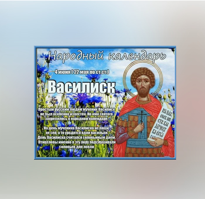 ТЕЛЕГРАММ замедляется.Вероятно скоро его заблокируют.Чтобы не потерять нас и получать оперативно информаци. подпишись на наши каналы в МАХ.Кто еще не подписался В полностью Российской сети МАХ на каналы ВОЕННЫЕ ПЕНСИОНЕРЫ ЗА РОССИЮ И ЕЕ ВООРУЖЕННЫЕ СИЛЫ: Канал для Военных пенсионерах без войны и политики, Военных пенсиях,пенсиях жен военных пенсионеров ,жизни военных пенсионеров и о способах прожить дольше : https://max.ru/voennyepen За Родину .Мы победим.: Оперативная информация О Спецоперации ,политике на канале: https://max.ru/join/aXh9SdoNhgk2rhy901ENolzCyoGLJhMgpon7E6np9n0 СРОЧНО ПОДПИСЫВАЙСЯ и ты будешь в курсе оперативных событий.НЕ пропусти!!! Дата в 2024 году: 4 июня , вторник Другие названия: День Василиска; Василиск-синитель; день синецвета; синюшник; блаваткин день; день лоскутницы; васильковый день; волошка; день волошки; Василиса-соловьиха; соловьиный день Церковное название: Мученика Василиска Значение: День памяти святого Василиска Команского Традиции: Хлопоты по дому Народный праздник Василиск отмечается 4 июня 2024 года (дата по старому стилю – 22 мая). По церковному календарю в этот день чтут память святого мученика Василиска Команского. История Василиск родился в III веке в городе Амасье, Каппадокия. Во времена гонений на христиан при императоре Максимиане Галерии его арестовали в городе Команы. В заточении ему явился Бог и поведал о своей поддержке в предстоящих испытаниях. Василиск упросил стражников отпустить его домой проститься с семьей. Воины пошли ему навстречу, так как почитали мученика за твердость духа, непогрешимость и кротость. Правитель города Агриппа узнал об этом и тут же приказал виновных наказать, а Василиска вернуть. Воины нашли мученика в доме родных, с которыми тот прощался и просил не терять веры. Они обули ему железные сапоги с вбитыми внутрь гвоздями и отправились обратно. По дороге сделали привал, приковали несчастного под палящим солнцем к сухому дереву, а сами расположились в тени. Когда Василиск изнемог от жажды, началось землетрясение, которое открыло в скале рядом с ним источник. От увиденного воины испугались и убежали. Василиск помнил о том, что Господь предсказал ему мученическую смерть, через которую он сможет вступить в царство Божье. Поэтому он сам вернулся в город и предстал перед Агриппой. Когда его заставили принести жертву в языческом капище, оно загорелось, а статуи рассыпались. После этого мученику отсекли голову, а тело хотели бросить в реку. Но христиане выкупили останки Василиска и тайно похоронили. Традиции и обряды В народный праздник Василиск не принято работать на земле, иначе вырастет лишь бурьян, полынь да васильки. Поэтому его посвящают хлопотам по дому. Существует легенда о том, что в этот день может родиться царь Василиск – существо с телом жабы, головой петуха и змеиным хвостом. От его взгляда все живое гибнет: источники и колодцы высыхают, девушки теряют красоту, а урожай вянет. Чтобы этого не произошло, накануне дня Василиска хозяева собирают все яйца и варят их вкрутую. Приметы Если ветер дует с севера, в ближайшие дни не будет осадков. Если посеять рожь в этот день, василек ее забьет. По пению соловья на рассвете судят о погоде – если оно радостное, значит, будет тепло. Девушки гадают по веночкам, сплетенным из березовых прутиков. Они бросают их в реку и смотрят: если они не тонут – удача не за горами. |