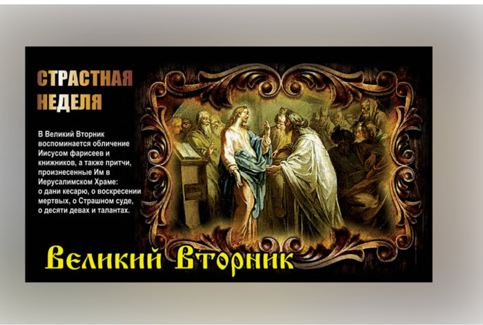 ТЕЛЕГРАММ замедляется.Вероятно скоро его заблокируют.Чтобы не потерять нас и получать оперативно информаци. подпишись на наши каналы в МАХ.Кто еще не подписался В полностью Российской сети МАХ на каналы ВОЕННЫЕ ПЕНСИОНЕРЫ ЗА РОССИЮ И ЕЕ ВООРУЖЕННЫЕ СИЛЫ: Канал для Военных пенсионерах без войны и политики, Военных пенсиях,пенсиях жен военных пенсионеров ,жизни военных пенсионеров и о способах прожить дольше : https://max.ru/voennyepen За Родину .Мы победим.: Оперативная информация О Спецоперации ,политике на канале: https://max.ru/join/aXh9SdoNhgk2rhy901ENolzCyoGLJhMgpon7E6np9n0 СРОЧНО ПОДПИСЫВАЙСЯ и ты будешь в курсе оперативных событий.НЕ пропусти!!! Дата в 2024 году: 30 апреля , вторник (вторник перед Пасхой) Другие названия: Страстной вторник; Чистый вторник; Великий вторник Страстной седмицы; Великий вторник перед Пасхой Церковное название: Великий вторник Значение: второй день Страстной недели, последней седмицы Великого поста Традиции: богослужения в храмах; перебирание одежды в гардеробе; приготовление соченого молока Великий вторник – народно-христианский праздник. Он отмечается в последний вторник перед Пасхой. Дата праздника в 2024 году – 30 апреля. Великий вторник – второй день Страстной недели, которая посвящена воспоминаниям о земных страданиях Иисуса Христа в последние дни Его жизни. История праздника Утром во вторник перед Пасхой Иисус Христос проповедовал в Иерусалимском храме. Он рассказывал о Своем втором пришествии, притчи о дани кесарю, воскресении мертвых, Страшном суде, десяти девах, о талантах. Фарисеи пытались лукавыми вопросами смутить и обличить Спасителя. Но мудрость Его ответов не оставила им шансов. Традиции и обряды праздника В Великий вторник в храмах проходят богослужения: утреня, великопостные часы с чтением Евангелия, вечерня с литургией Преждеосвященных Даров, великое повечерие. В народе в этот день люди перебирают одежду в гардеробе: стирают, гладят и штопают, избавляются от ненужных вещей. Готовят наряд на Пасху. В некоторых регионах принято до рассвета готовить соченое молоко. Что можно кушать в Великий вторник В Великий вторник верующие соблюдают строгий пост. Согласно церковному уставу, в этот день разрешается употреблять невареную пищу растительного происхождения: хлеб, воду, соль, сырые овощи и фрукты, сухофрукты, мед, орехи. Что нельзя делать в Великий вторник По церковным правилам, в этот праздник запрещается ругаться, нецензурно выражаться, думать о плохом. Нельзя веселиться: петь, танцевать. Приметы и поверья на Великий вторник Сырой день – к урожаю грибов. Если животное умыть талым снегом в Великий вторник, то оно не будет болеть весь год. Если на заре напоить скотину и домашних животных соченым молоком – это убережет их от болезней на год. | |