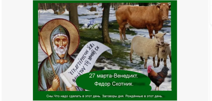 Дата в 2026 году: 27 марта , пятница Другие названия: День Венедикта; Венедикт; Венедикт-Скотник Церковное название: Преподобного Венедикта Нурсийского, игумена Значение: Почтение памяти святого Венедикта Традиции: Уход за домашним скотом и местами содержания животных; заговоры, молитвы, обереги для животных Народный праздник Венедиктов день отмечается 27 марта 2026 года (по старому стилю – 14 марта). В православном календаре это дата почтения памяти преподобного Венедикта Нурсийского, игумена. Название «Скотник» праздник получил в честь домашней скотины, у которой к этому сроку происходит смена шерсти и подшерстка. История Венедикт родился в 480 году в городе Нурсии, Италия. В 14 лет его отправили учиться в Рим. Он поразился безнравственностью жителей города настолько, что решил избрать для себя другую жизнь. Его первым пристанищем стала церковь апостола Петра в Еффеди. Затем несколько лет он провел в горах. Три года понадобилось ему для борьбы с искушениями. После этого многие люди, которые узнали про его подвиг, приходили жить под его руководством. Спустя несколько лет Венедикт поселился в Кампанийской стране, у города Касина. На одной из гор он разрушил языческий храм и на его месте воздвиг церковь в честь Иоанна Крестителя. Рядом построили монастырь, в котором Венедикт стал игуменом и ввел очень жесткие правила жизни (устав). Преподобный прославился написанным уставом, который позднее применяли во многих монастырях. Кроме того, он обладал силой чудотворения и прозрения. Совершил много богоугодных дел. Однажды смог даже воскресить ребенка. Умер Венедикт в 543 году. Традиции и обряды В этот день ухаживают за скотиной и домашними животными. К этому сроку у них начинается весенняя линька. Животных чистят, скребут, вычесывают, моют. Места их содержания также не остаются без внимания. Конюшни, хлевы, сараи, будки приводят в порядок. Меняют подстилку, убирают старую солому, грязь и навоз. Проводят различные обряды и ритуалы, читают охранные заговоры. Они помогают уберечь животных от сглаза и порчи. 27 марта принято молиться о наступлении мира на родной земле. Приметы Гром в Венедиктов день – год будет урожайным и плодородным. Если 27 марта мороз, значит, он продержится еще семь дней. Корова плохо подоилась, значит, скоро погода ухудшится. Громкое кудахтанье кур – к семейной ссоре. Нельзя охотиться, брать в руки оружие, колоть дрова и точить ножи – это к несчастью. Считается, что на Венедикта увеличивается влияние потустороннего мира на людей. Поэтому рекомендуется не смотреть в зеркала в течение всего дня. | |