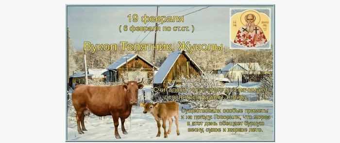 ТЕЛЕГРАММ замедляется.Вероятно скоро его заблокируют.Чтобы не потерять нас и получать оперативно информаци. подпишись на наши каналы в МАХ.Кто еще не подписался В полностью Российской сети МАХ на каналы ВОЕННЫЕ ПЕНСИОНЕРЫ ЗА РОССИЮ И ЕЕ ВООРУЖЕННЫЕ СИЛЫ: Канал для Военных пенсионерах без войны и политики, Военных пенсиях,пенсиях жен военных пенсионеров ,жизни военных пенсионеров и о способах прожить дольше : https://max.ru/voennyepen За Родину .Мы победим.: Оперативная информация О Спецоперации ,политике на канале: https://max.ru/join/aXh9SdoNhgk2rhy901ENolzCyoGLJhMgpon7E6np9n0 СРОЧНО ПОДПИСЫВАЙСЯ и ты будешь в курсе оперативных событий.НЕ пропусти!!! В Телеграмм создана группа " Военные пенсионеры за Россию и ее ВС. Мы победим". У кого есть Телеграмм просим вступить в нее. Там много интересного, срочного, очень оперативная информация, а также чего нельзя помещать в ОДНОКЛАССНИКАХ и на сайте. Вступить можно по ссылке: Военные пенсионеры за Россию и ее ВС. Мы победим "https://t.me/voenpenszaRossiu" Очень большая просьба НЕ ОТПИСЫВАТЬСЯ ОТ КАНАЛА, Канал работает в тестовом режиме. Мы стараемся понять, что Вам будет интересно читать и как работать дальше. Пишите, что бы Вам хотелось читать в ТЕЛЕГРАММ. Хоть в любой теме на сайте, хоть в Телеграмм. Чтобы не раздражали уведомления их можно ОТКЛЮЧИТЬ. Кого раздражают уведомления в Телеграмм их можно отключить. Отключить уведомления можно нажав на надпись ОТКЛЮЧИТЬ УВЕДОМЛЕНИЯ внизу Дата в 2025 году: 19 февраля , среда Другие названия: Вукол; Телятник; Телятницы Церковное название: Преподобного Вукола Смирнского, епископа Значение: Почтение памяти святого Вукола Традиции: Молитвы об успешных родах у коровы Народный праздник Вукол Телятник отмечается 19 февраля 2025 года (по старому стилю – 6 февраля). В православном церковном календаре это дата почтения памяти преподобного Вукола Смирнского, епископа. В народе его прозвали Телятником, поскольку на этот период приходится отел коров. Второе название праздника – Жуколы. Так в простонародье зовут телят, родившихся в феврале. История Вукол был учеником апостола Иоанна Богослова, который поставил его первым епископом в церкви города Смирна (Малая Азия). Преподобный крестил многих язычников, открыл им глаза на истинную веру. Скончался примерно в 100 году. На том месте, где расположена его могила, выросло миртовое дерево. Отличалось оно тем, что исцеляло больных. Традиции и обряды В этот день принято молиться об успешных родах у коровы, чтобы и детеныш, и мать перенесли их как можно легче. После благополучного отела хозяйки ждут, когда пройдет молозиво. Как только корова вновь начнет давать пригодное молоко, из него варится каша. Затем с ней проводят специальный обряд. Считается, что он способствует в дальнейшем безболезненным отелам и появлению здоровых телят. Приметы Большинство примет в этот день связано с коровами и телятами. Если в этот день беременная корова спит головой на запад, то к вечеру или к ночи она разродится. Если родилась двойня одной масти – это к добру. Если у телят разный окрас – к беде. Нельзя гладить по спине новорожденного теленка, иначе он заболеет. Если 19 февраля началось потепление, то у коров будет мало молока, и они будут плохо доиться. Чем теплее этот день, тем холоднее будет март. Если на Вукола Телятника стоят морозы, значит, весна будет с ветрами и грозами, а лето жарким. | |