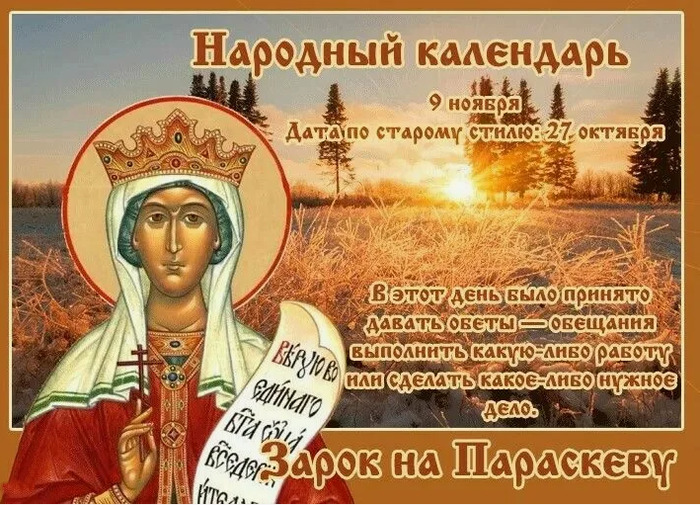ТЕЛЕГРАММ замедляется.Вероятно скоро его заблокируют.Чтобы не потерять нас и получать оперативно информаци. подпишись на наши каналы в МАХ.Кто еще не подписался В полностью Российской сети МАХ на каналы ВОЕННЫЕ ПЕНСИОНЕРЫ ЗА РОССИЮ И ЕЕ ВООРУЖЕННЫЕ СИЛЫ: Канал для Военных пенсионерах без войны и политики, Военных пенсиях,пенсиях жен военных пенсионеров ,жизни военных пенсионеров и о способах прожить дольше : https://max.ru/voennyepen За Родину .Мы победим.: Оперативная информация О Спецоперации ,политике на канале: https://max.ru/join/aXh9SdoNhgk2rhy901ENolzCyoGLJhMgpon7E6np9n0 СРОЧНО ПОДПИСЫВАЙСЯ и ты будешь в курсе оперативных событий.НЕ пропусти!!! Дата в 2023 году: 9 ноября , четверг Другие названия: Обеты Значение: Канун дня великомученицы Параскевы, нареченной Пятница Традиции: Давание обетов; прядение пелены (покрывала на икону) Праздник Зарок на Параскеву отмечается 9 ноября 2023 года (дата по старому стилю – 27 октября). В народе его также называют Обетами, по причине произнесения в этот день обещания о выполнении какой-либо работы либо заповеди. В православной традиции это канун дня великомученицы Параскевы, нареченной Пятница. История В III веке в Малой Азии проживала семья богатого сенатора. Супруги не имели детей и просили Господа Бога, чтобы он ниспослал им ребенка. Особо они почитали пятницу и молились в этот день усерднее обычного. Господь услышал их просьбы, и в пятницу у них родилась дочь, нареченная Параскевой. Так как семья исповедовала христианскую веру, девочка была воспитана в благочестии и чистоте. Параскева рано потеряла отца с матерью, но ее не сломило это несчастье. Она всем сердцем верила в Иисуса Христа и продолжала творить добрые дела, начатые родителями. Все перешедшие ей богатства Параскева тратила на нужды бедных: одежду, пропитание. Она была очень красивой девушкой, но на все ухаживания молодых людей отвечала отказом, посвящая себя только Господу Богу. Во времена Диоклетианских гонений на христиан Параскева не отреклась от веры, а продолжала проповедовать и учить истине сограждан. Тогда император приказал схватить ее и подвергнуть пыткам. После жесточайших истязаний она была обезглавлена. Традиции и обряды В этот народный праздник произносят обеты – обещания, добровольные обязательства сделать что-либо. Чтобы отогнать пришедшую в дом беду, дают зарок (клятвенное обещание не делать чего-нибудь). Он обязательно должен быть исполнен в молчании. На следующий день необходимо сходить в церковь и помолиться святой Параскеве. В ночь с 9 на 10 ноября женщины начинают прясть пелену – покрывало для иконы. Приметы Если гусь заходит на лед, значит, зима еще не скоро придет. Если поутру на ветках деревьев лежит иней – жди мороза. Если утром стелется туман – оттепель не за горами. Если актер после спектакля возьмет с собой домой принесенные и подаренные ему цветы, то его популярность угаснет. Сайт существует только благодаря Вам ,посетители и пользователи сайта. Кто хочет помочь сайту добровольно, перечислите деньги в сумме от 1 рубля на карту 4006800071005382 . Любая помощь в любом объеме поможет сайту выжить. Для перевода воспользуйтесь услугой Вашего банка онлайн через приложение или сходите в банк. Спасибо всем кто помогает сайту выжить !!! | |