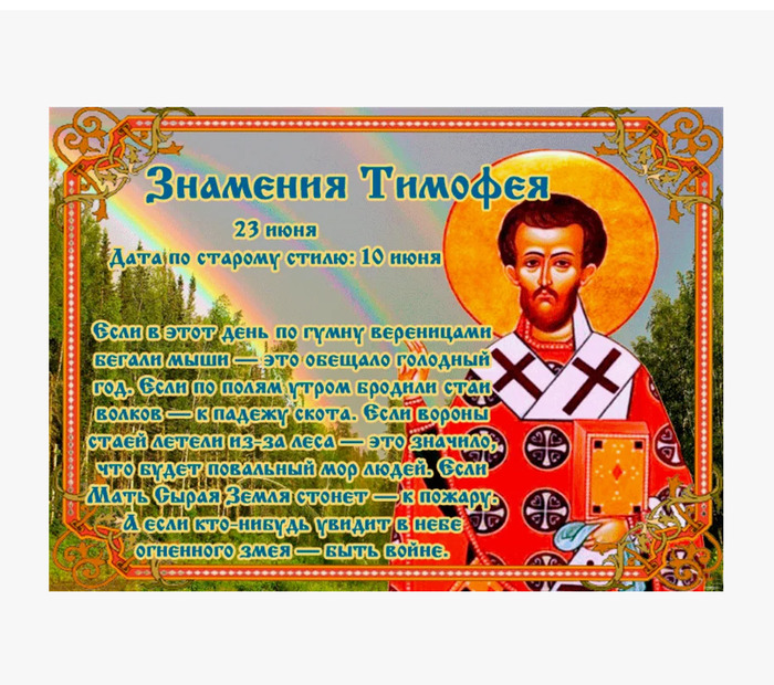 ТЕЛЕГРАММ замедляется.Вероятно скоро его заблокируют.Чтобы не потерять нас и получать оперативно информаци. подпишись на наши каналы в МАХ.Кто еще не подписался В полностью Российской сети МАХ на каналы ВОЕННЫЕ ПЕНСИОНЕРЫ ЗА РОССИЮ И ЕЕ ВООРУЖЕННЫЕ СИЛЫ: Канал для Военных пенсионерах без войны и политики, Военных пенсиях,пенсиях жен военных пенсионеров ,жизни военных пенсионеров и о способах прожить дольше : https://max.ru/voennyepen За Родину .Мы победим.: Оперативная информация О Спецоперации ,политике на канале: https://max.ru/join/aXh9SdoNhgk2rhy901ENolzCyoGLJhMgpon7E6np9n0 СРОЧНО ПОДПИСЫВАЙСЯ и ты будешь в курсе оперативных событий.НЕ пропусти!!! Дата в 2024 году: 23 июня , воскресенье Другие названия: День Тимофея; Тимофей; Тимофеев день; Тимофей знаменный; Тимофеевы знамения; Тимофей Знамений; день призраков; Знамения Церковное название: Священномученика Тимофея, епископа Прусского Значение: День памяти священномученика Тимофея Прусского, епископа Традиции: Внимание к мелочам с целью найти в них пророческий смысл; обряды по избавлению от нечистой силы Народный праздник Знамения Тимофея отмечается 23 июня 2024 года (дата по старому стилю – 10 июня). В православном календаре день посвящается памяти священномученика Тимофея Прусского, епископа. В это время случаются разные природные явления, которые люди рассматривают как предзнаменование чего-либо. Отсюда и пошло название праздника «Знамения». История Тимофей жил в городе Пруссе (Малая Азия) в IV веке. Когда он уже был епископом, за святость и чистоту жизни Господь наделил его умением исцелять смертельные недуги и совершать другие чудеса. Однажды Тимофей излечил царя Арита, который уже не надеялся выздороветь и готовился умереть. В другой раз он безбоязненно отправился умертвить змея, который объявился недалеко от Вифинии и пожирал животных и людей. Силой молитвы и накинутым на морду покровом для освященного хлеба епископу удалось убить зверя. Когда на римский трон взошел Юлиан, начались преследования христианской веры. Епископа арестовали и заточили в темницу. Там он продолжил проповедовать, несмотря на предупреждения правителя. Дважды Юлиан приказывал Тимофею прекратить поддержку и учения христиан, и дважды тот ослушался нечестивого царя. Правитель обозлился и приказал тайно в темнице отсечь епископу голову. Приходившие послушать Тимофея узнали о его смерти и вытребовали тело мученика, чтобы похоронить святые останки как полагается. Традиции и обряды В День Тимофея люди проявляют пристальный интерес ко всем мелочам, стараясь найти в них пророческий смысл. С этого дня по земле начинают ходить призраки и приставать ко всем. Чтобы отогнать от себя нечистую силу, принято париться в бане, купаться в прудах и реках, добавляя в воду полынь, ромашку или папоротник. Приметы Погода хорошая, а муравьев не видно – к ненастью. Во время грозы сначала плывут светлые, а потом темные тучи – к граду. В лесу вечером теплее, чем в поле, значит, будут погожие дни. Радуга в этот день предвещает голодный год. Увидеть в небе огненное коромысло, которое напоминает по форме змея – к войне. Увидеть мышей – к бедному урожаю. Увидеть свет в своем доме – к счастью. Обознаться – к покойнику или к свадьбе. Потерять перчатку – к беде. Зеркало разбить – к большому лиху. У выпекающегося хлеба сбоку ком вылез – к смерти хозяина или хозяйки дома. 