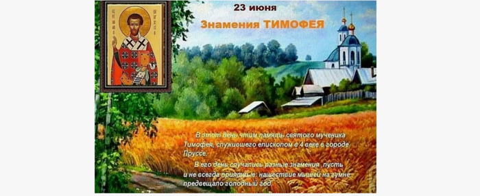 ТЕЛЕГРАММ замедляется.Вероятно скоро его заблокируют.Чтобы не потерять нас и получать оперативно информаци. подпишись на наши каналы в МАХ.Кто еще не подписался В полностью Российской сети МАХ на каналы ВОЕННЫЕ ПЕНСИОНЕРЫ ЗА РОССИЮ И ЕЕ ВООРУЖЕННЫЕ СИЛЫ: Канал для Военных пенсионерах без войны и политики, Военных пенсиях,пенсиях жен военных пенсионеров ,жизни военных пенсионеров и о способах прожить дольше : https://max.ru/voennyepen За Родину .Мы победим.: Оперативная информация О Спецоперации ,политике на канале: https://max.ru/join/aXh9SdoNhgk2rhy901ENolzCyoGLJhMgpon7E6np9n0 СРОЧНО ПОДПИСЫВАЙСЯ и ты будешь в курсе оперативных событий.НЕ пропусти!!! В Телеграмм создана группа " Военные пенсионеры за Россию и ее ВС. Мы победим". У кого есть Телеграмм просим вступить в нее. Там много интересного, срочного, очень оперативная информация, а также чего нельзя помещать в ОДНОКЛАССНИКАХ и на сайте. Вступить можно по ссылке: Военные пенсионеры за Россию и ее ВС. Мы победим "https://t.me/voenpenszaRossiu" Очень большая просьба НЕ ОТПИСЫВАТЬСЯ ОТ КАНАЛА, Канал работает в тестовом режиме. Мы стараемся понять, что Вам будет интересно читать и как работать дальше. Пишите, что бы Вам хотелось читать в ТЕЛЕГРАММ. Хоть в любой теме на сайте, хоть в Телеграмм. Чтобы не раздражали уведомления их можно ОТКЛЮЧИТЬ. Кого раздражают уведомления в Телеграмм их можно отключить. Отключить уведомления можно нажав на надпись ОТКЛЮЧИТЬ УВЕДОМЛЕНИЯ внизу Дата в 2025 году: 23 июня , понедельник Другие названия: День Тимофея; Тимофей; Тимофеев день; Тимофей знаменный; Тимофеевы знамения; Тимофей Знамений; день призраков; Знамения Церковное название: Священномученика Тимофея, епископа Прусского Значение: День памяти священномученика Тимофея Прусского, епископа Традиции: Внимание к мелочам с целью найти в них пророческий смысл; обряды по избавлению от нечистой силы Народный праздник Знамения Тимофея отмечается 23 июня 2025 года (дата по старому стилю – 10 июня). В православном календаре день посвящается памяти священномученика Тимофея Прусского, епископа. В это время случаются разные природные явления, которые люди рассматривают как предзнаменование чего-либо. Отсюда и пошло название праздника «Знамения». История Тимофей жил в городе Пруссе (Малая Азия) в IV веке. Когда он уже был епископом, за святость и чистоту жизни Господь наделил его умением исцелять смертельные недуги и совершать другие чудеса. Однажды Тимофей излечил царя Арита, который уже не надеялся выздороветь и готовился умереть. В другой раз он безбоязненно отправился умертвить змея, который объявился недалеко от Вифинии и пожирал животных и людей. Силой молитвы и накинутым на морду покровом для освященного хлеба епископу удалось убить зверя. Когда на римский трон взошел Юлиан, начались преследования христианской веры. Епископа арестовали и заточили в темницу. Там он продолжил проповедовать, несмотря на предупреждения правителя. Дважды Юлиан приказывал Тимофею прекратить поддержку и учения христиан, и дважды тот ослушался нечестивого царя. Правитель обозлился и приказал тайно в темнице отсечь епископу голову. Приходившие послушать Тимофея узнали о его смерти и вытребовали тело мученика, чтобы похоронить святые останки как полагается. Традиции и обряды В День Тимофея люди проявляют пристальный интерес ко всем мелочам, стараясь найти в них пророческ